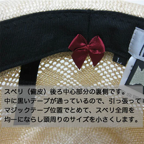 帽子の内側にある、汗取り部分を裏返すとサイズ調整ベルトになっているので、これでサイズ調整を行うことができます。※最大-2cmまで