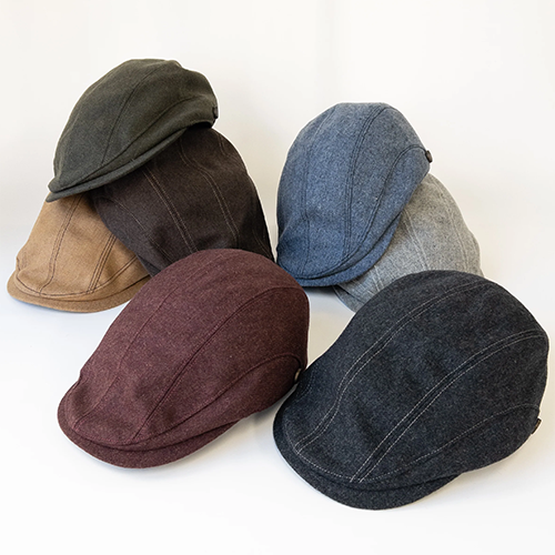 主力の中折れフェルトハットの他にも、中村社長のデザイナーとしての遊び心が存分に詰まったラインナップが並ぶ。例えば、丁寧に型入れを施すことでニット素材特有の柔らかさを持ちながらも、美しいフォルムが崩れにくい「中折れニットハット」は、リボンの代わりにリブ編みを施した独創的なデザインにより、日常のカジュアルな装いを格上げするアイテムとして最適だ。また、中村社長の原点であり最も得意とする「立体ハンチング」は、一般的な一枚布の構造とは異なり、緻密な切り返しによって頭のラインに寄り添う造形美を追求している。内側でサイズ調節ができるガリュー・プラネットならではの仕様に加え、シックなモヘア素材や手洗い可能なウォッシャブルウールの採用など、機能とスタリングを両立させたモデルが根強い人気を博している。さらに、近年オーダーが急増しているキャップのカテゴリーにおいても、かつて展示会で話題をさらった牛革オーストリッチ風のデザインに代表されるように、既存の概念にとらわれないインパクトのある提案を続けており、まさに「よそとは一味違う」個性を放っている。v