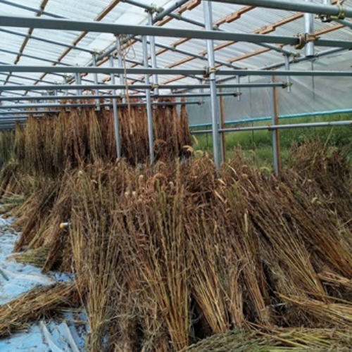 「実がなり、刈り取ってからのごまの保管にも細心の注意を払っています。ごまの生命線は酸化を防ぐこと。ごまを野ざらしに放置しておくと、雨風をうけてあっというまに酸化してしまいます。駒ヶ根では他の産地とは違い、全てのごま農家が刈り取ってすぐにハウスに入れて風雨をしのぎ、ごまを乾燥させています。」刈り取り作業が集中する収穫時期に、ハウスへ運搬し丁寧に保管するのは手間がかかる仕事だ。それでも品質に大きく影響をおよぼすため欠かすことはできない。手をかけ、丁寧に栽培・収穫した駒ヶ根の黒ごまは、色が濃く、粒も大きい。そして含有水分も豊富。香り高く、コクがあり、甘味がしっかりしている駒ヶ根の黒ごまの味はこのこだわりから生まれるのだ。