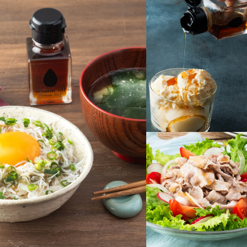 「sesame oil ~Premium Black~(セサミオイル プレミアムブラック)」はどんな料理にも合う。寿司や刺身、ローストビーフやピザやサラダ、アイスなどのデザートにも合う。1滴で十分香りや味わいが広がり、従来のごま油とちがってサラサラとした油のため食材に広がりやすいのも特徴だ。セサミンやゴマリグナなど、ごまの油に含まれる成分は、ごまとしてではなくごま油として摂取する方がたっぷりとれる。特に一番搾りのごま油は、2番絞りや3番絞りのごま油の搾油で使われる薬剤が使用されないから体にも嬉しい。その香りと味わいで減塩効果もでるだろう。ぜひとも食卓に「sesame oil ~Premium Black~(セサミオイル プレミアムブラック)」を置いてその味と香りを試してみて欲しい。きっと健康で豊かな毎日を過ごすことができるだろう。